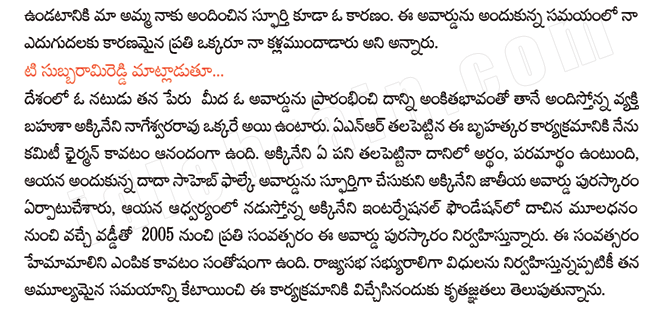Named after Dr. Akkineni Nageshwara Rao, the ANR award honors artists who made distinguished contribution to the growth and promotion of film medium and carries prize money of Rs. 5lakhs.