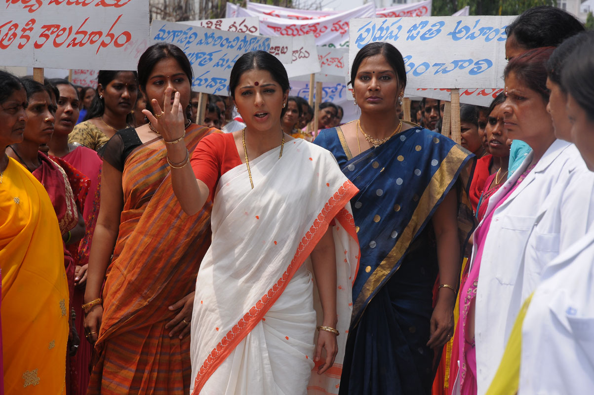 “An M.B.A gold medallist, Bhumika has an unfulfilled dream. Hailing from an agricultural family, she has a vision to guide villagers to a new financial system beneficial to them. But her father wishes otherwise. He decides to marry her off to his friend’s son Gautham, an IAS officer (played by Prakash Raj). After marriage, she is reduced to obeying the dictates of her husband. It happens in every family. The girl’s father thinks he knows what is best for his daughter and the husband thinks that he is providing every comfort she needs. In most cases, both do not bother to find out what really is in her mind. When the protagonist, after years of submission to male chauvinism, finally raises her voice, hundreds of such deprived women join her,” he explains at length the genesis of the scene being shot.