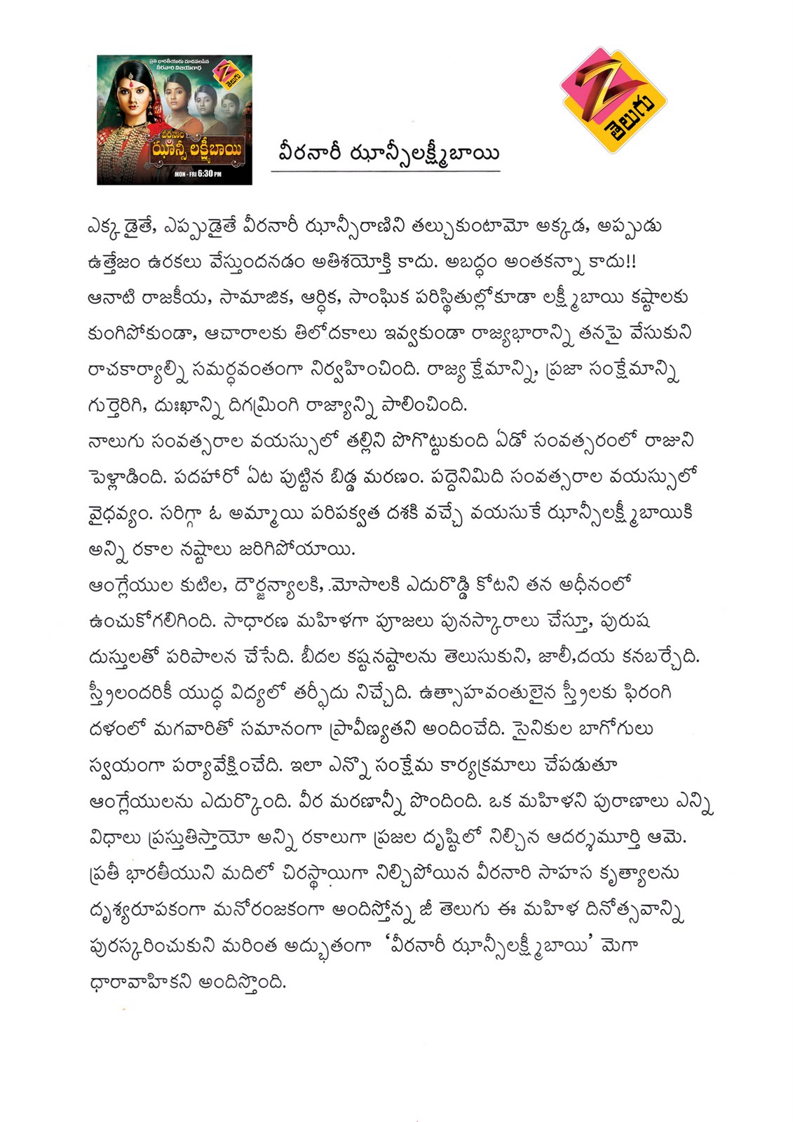Jhansi Lakshmi Bai on zee Telugu