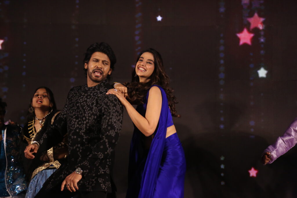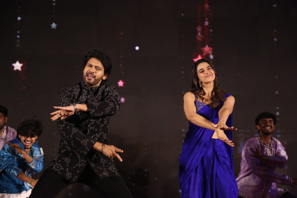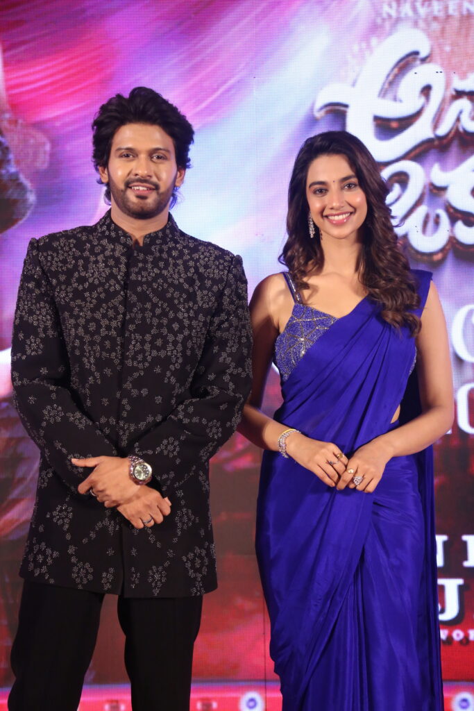 Lead pair Naveen Polishetty and Meenakshi Chaudhary energized the crowd by dancing to the songs Bhimavaram Balma and Raju Gari Pelli ro, from the film. Following the performance, they welcomed guests just like a real wedding reception. Appearing on stage as a “newlywed couple,” the duo was the center of attraction. In a fun twist, journalists approached the stage like relatives to bless the couple, handing over “gift covers” and asking questions in return.