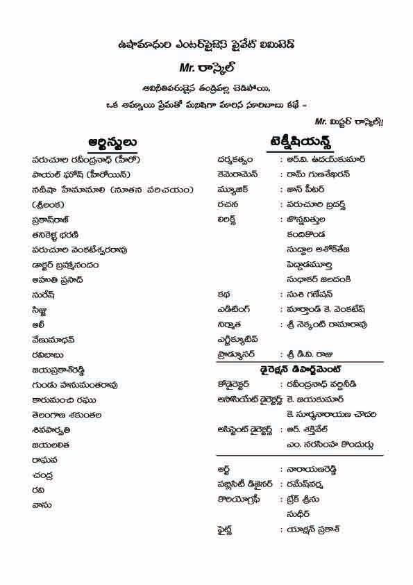 Ace writer Paruchuri Venkateswara Rao’s son Ravindranath is going to act as the hero in the film titled ‘Mr.Rascal’ which is a love entertainer. ‘Prayanam’ fame heroine Payal Ghosh and Srilankan beauty Nadisha Hemamali play lead heroines with Ravindranath. This movie is directed by R V Udaykumar of ‘Tarakaramudu’ fame. The audio for this movie will be launched on April 22nd in Hyderabad. On Saturday, Paruchuri Gopalakrishna launched the logo of this movie. Speaking about this movie Paruchuri Gopalakrishna said that it is a story of a youngster who is spoilt by the corruption and wealth of his dad and how he changes his attitude in life after meeting a girl. This script has vast scope for performance and is confident that hero Ravindranath will become a super star after this film. With this flick hero Ravindranath is desperately trying to prove his mettle as hero in the Tollywood. Music director John Peter is giving music for this flick. This flick is set to release next month. Will hero Ravindranath come up with the success this time and earn reputation to his father?